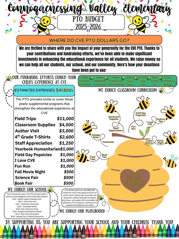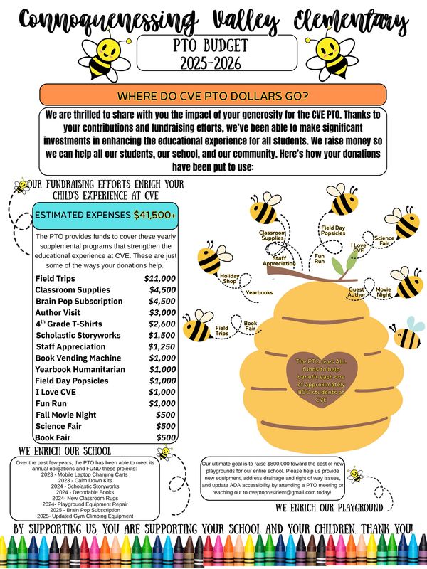 The CVE PTO is the parent-teacher organization for CVE and 501c(3) charitable organization. Each year, we volunteer in the school and strive to raise funds for projects and materials that enrich our children's learning experience.